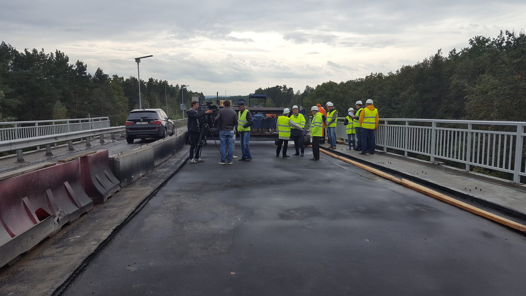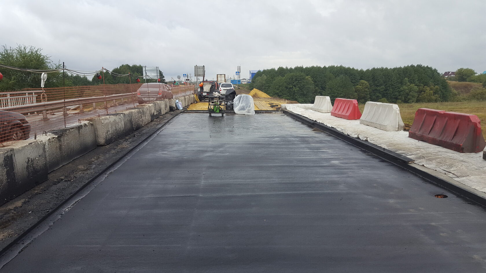 На глазах у собравшихся гидроизоляцию моста через Цну выполнили напыляемой битумно-полимерной эмульсией «Дорфлекс». Получаемая мембрана надежно предохраняет пролетное строение от влаги и в то же время не боится высоких температур (до +260 градусов Цельсия), поэтом укладывать асфальт можно прямо на нее. А на путепроводе присутствующих познакомили с технологией укладки литого асфальтобетона, точнее сказать, устройстве покрытия из него. Смесь не укладывают, а наливают на подготовленную поверхность. Консистенция асфальта напоминает мастику, он сам равномерно распределяется по площади, не требуя работы катка для уплотнения. Покрытие получается водонепроницаемым, устойчивым к деформациям и перепаду температур.